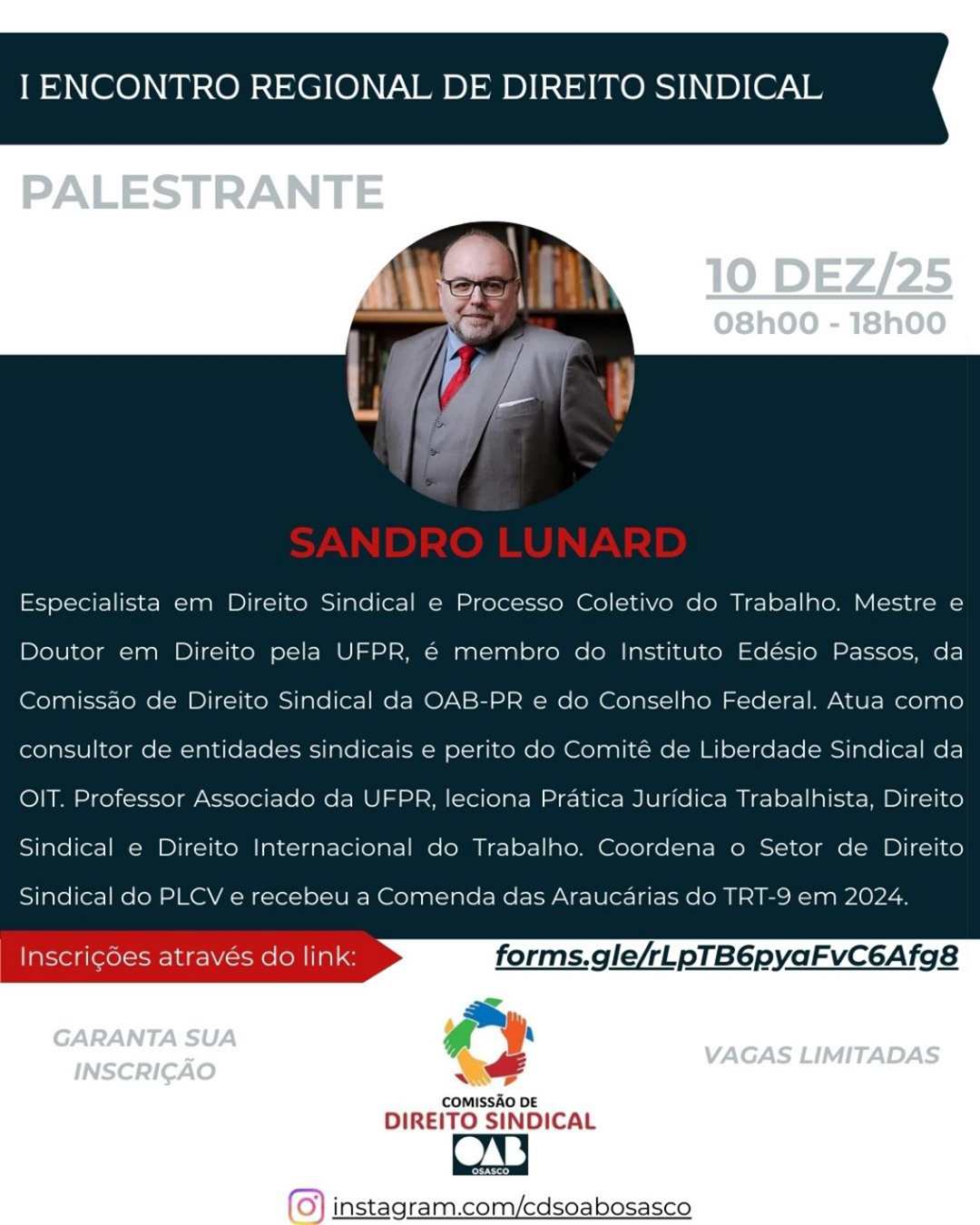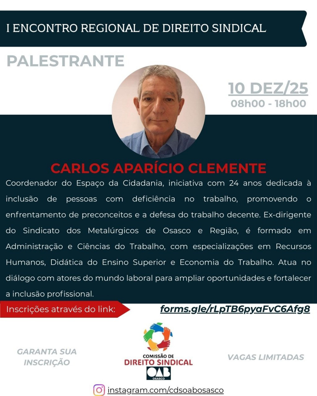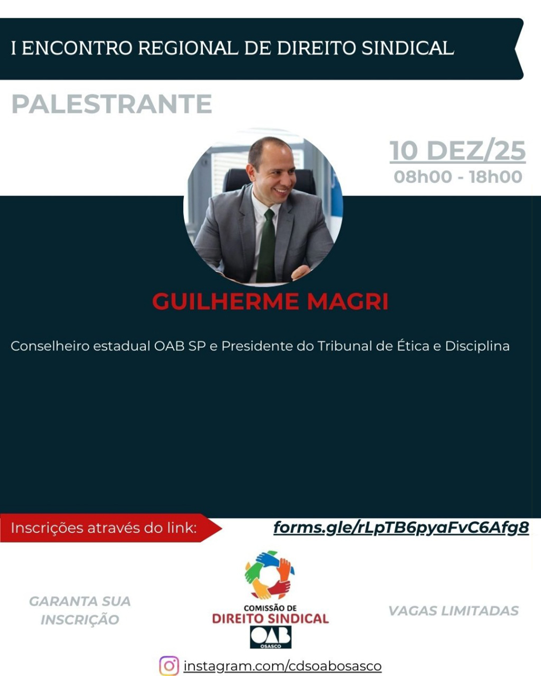 A OAB Osasco, por meio da Comissão de Direito Sindical (CDS), realiza no dia 10 de dezembro o I Encontro Regional de Direito Sindical, iniciativa que tem o Siemaco Osasco entre as entidades apoiadoras. O evento será promovido das 8h às 18h, na Sala Osasco, e reunirá dirigentes sindicais, advogados e especialistas para discutir temas centrais das relações de trabalho na atualidade.