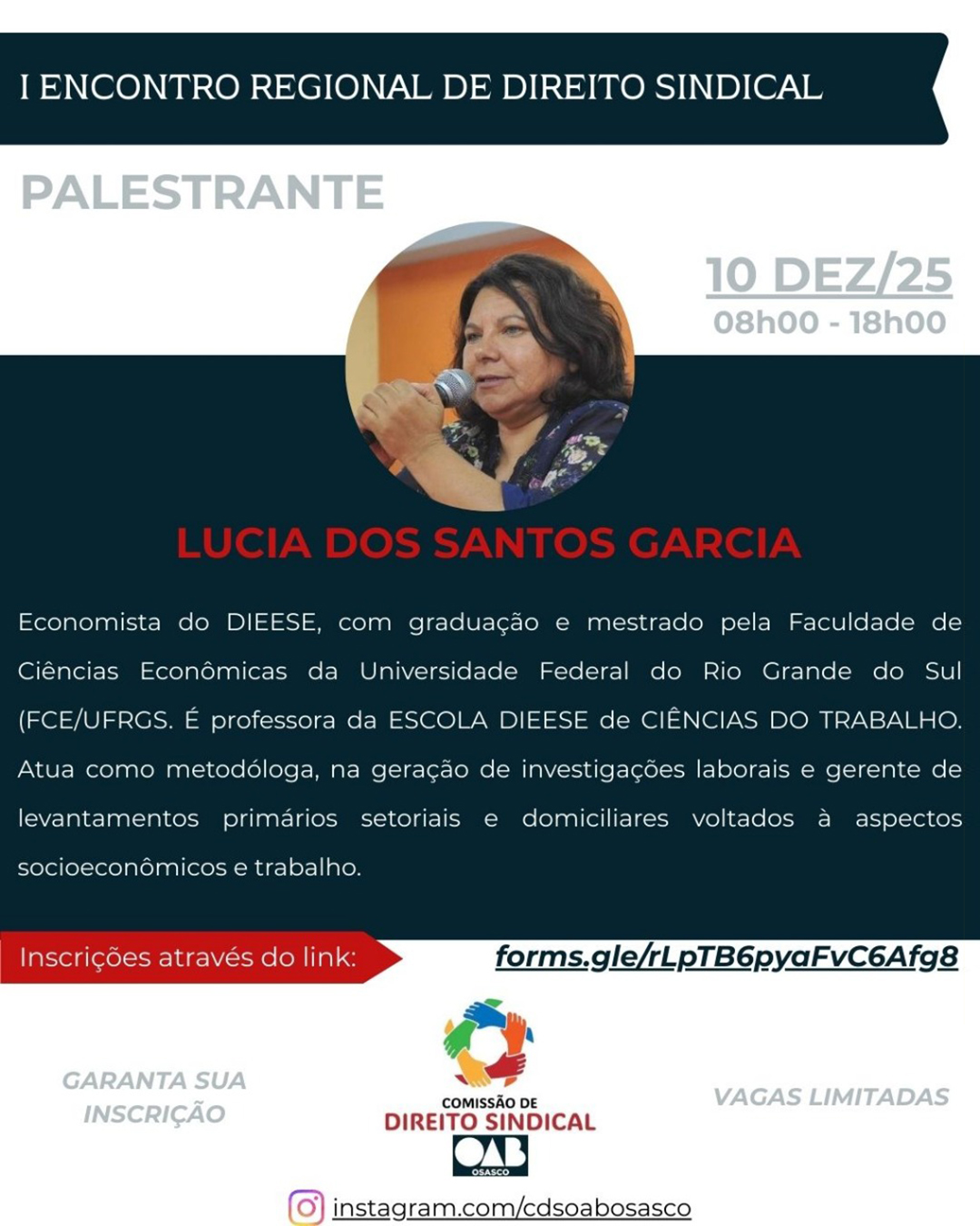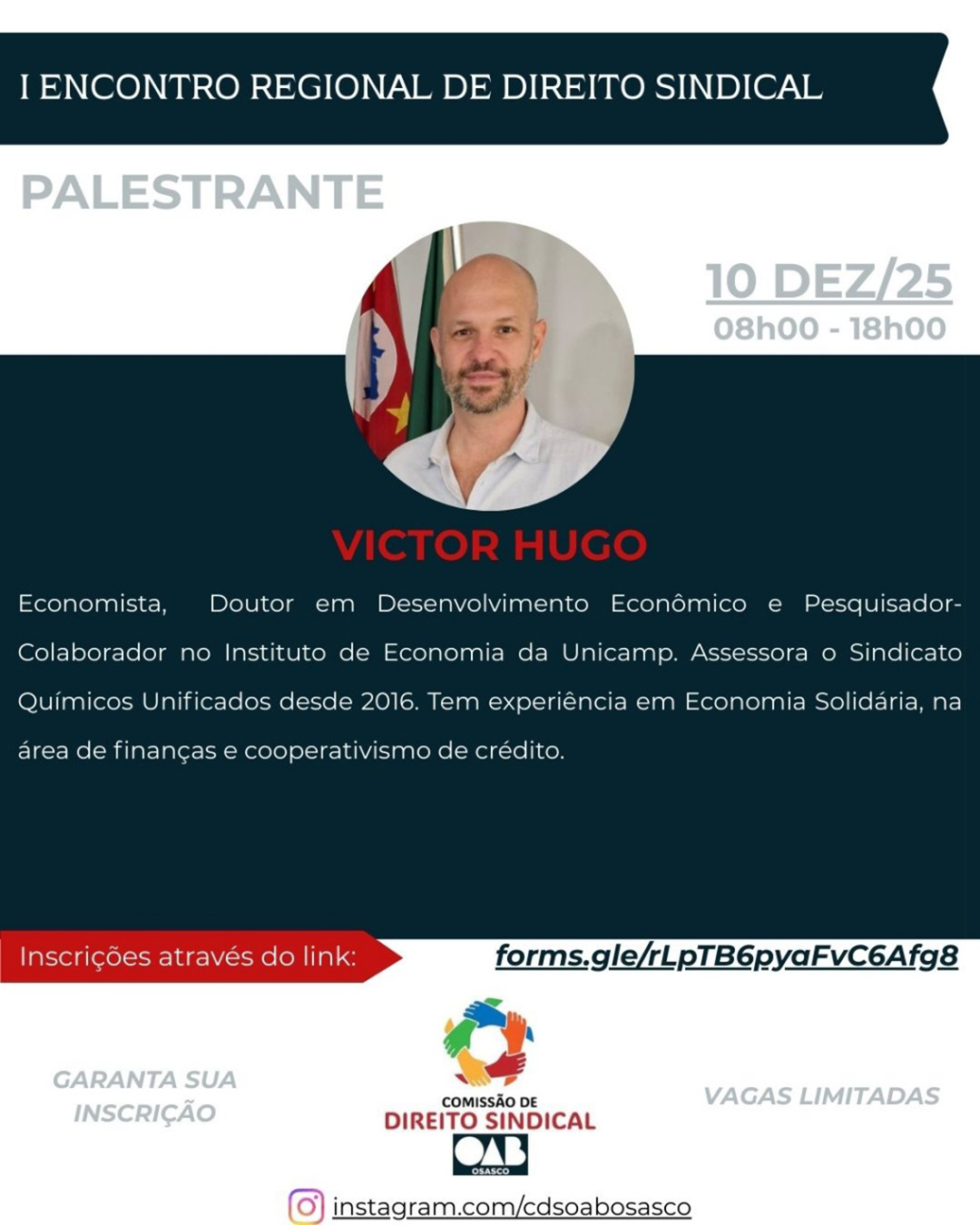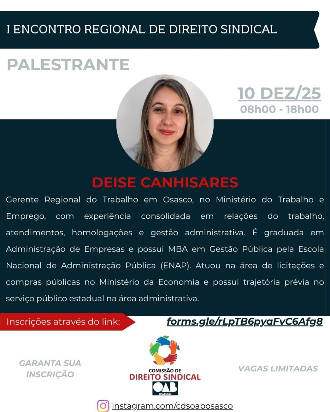A OAB Osasco, por meio da Comissão de Direito Sindical (CDS), realiza no dia 10 de dezembro o I Encontro Regional de Direito Sindical, iniciativa que tem o Siemaco Osasco entre as entidades apoiadoras. O evento será promovido das 8h às 18h, na Sala Osasco, e reunirá dirigentes sindicais, advogados e especialistas para discutir temas centrais das relações de trabalho na atualidade.